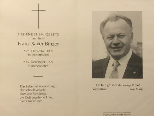 Im Alter von 60 Jahren verstirbt der ehemalige Schützenmeister Franz Xaver Binzer
