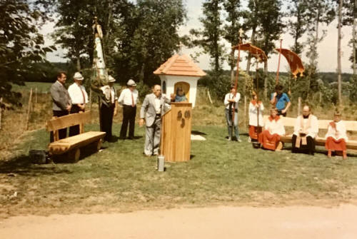Im "Leahada Moos" wird das Marterl errichtet. Pfarrer German Fischer weiht es ein. Das Marterl ist den drei Heiligen St.Leonhard, Franz v. Assisi und der Mutter Gottes gewidmet