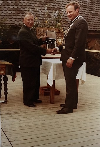 ![]() Gauschützenmeister Baudrexl überreicht die Königskette (rechts Vorgänger J.Schwarz aus Oberbernbach |